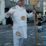 He wears a colourful tailcoat with large buttons, a plain waistcoat, a white shirt, white trousers with the same fabric trim as the tailcoat and large buttons on the outer hem, a white collar, a large bow tie, a small top hat adorned with a peacock feather, a red wig and a long ramon (a kind of long chimney sweep’s brush with at the end a bouquet of broom).