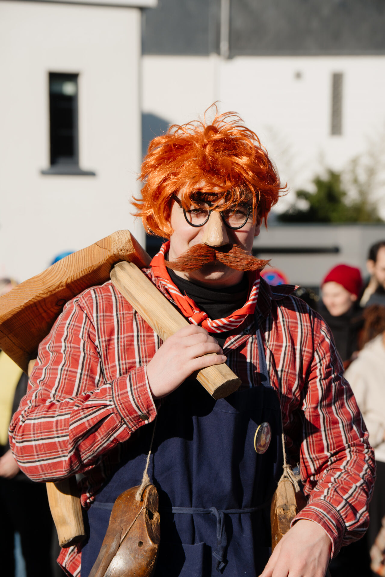 The coat is made of cayèts that clatter together with the slightest movement. He is equipped with a foam club and gently messes up the spectators’ hair.