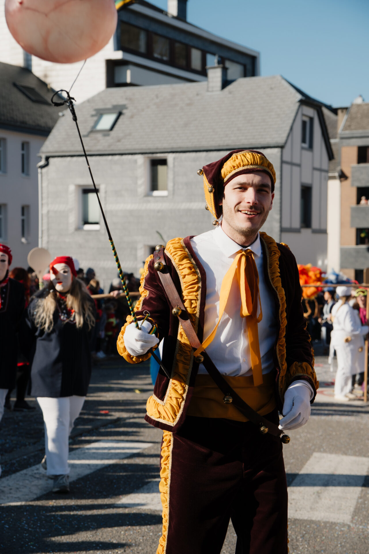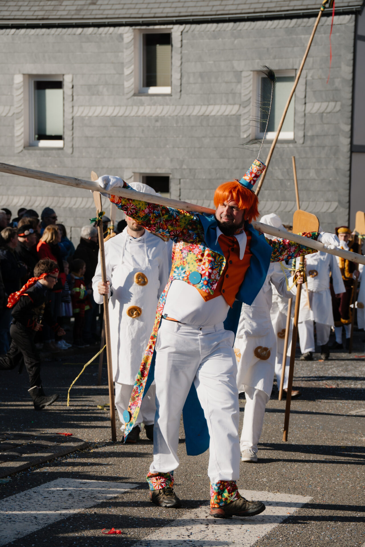 He wears a colourful tailcoat with large buttons, a plain waistcoat, a white shirt, white trousers with the same fabric trim as the tailcoat and large buttons on the outer hem, a white collar, a large bow tie, a small top hat adorned with a peacock feather, a red wig and a long ramon (a kind of long chimney sweep’s brush with at the end a bouquet of broom).