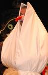 This character wears white trousers, a white sheet covering the head and arms, which are tied at the waist with a white cord, and a mask with a long hooked nose.