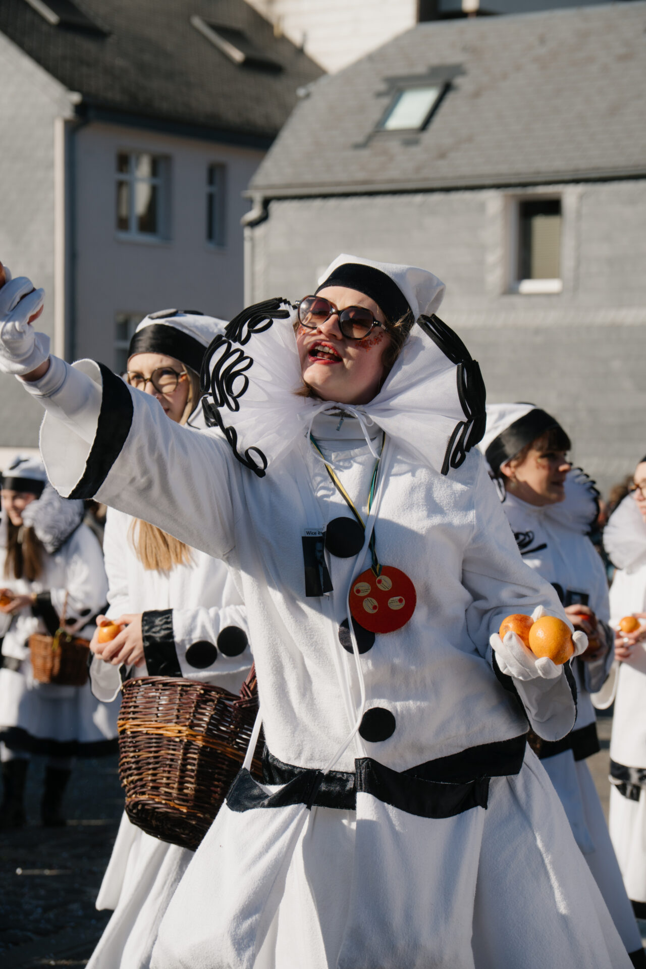 He distributes nuts and oranges to the audience, who shout ‘Poor Pierrot, who has no money!’ at him « Pôve Pièrot ki n’a pus dès djèyes ! » « Poor Pièrot who has no nuts anymore »