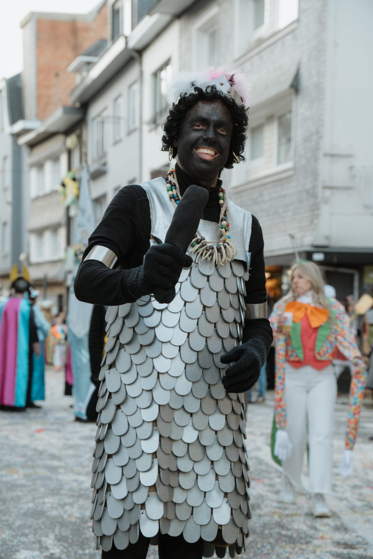 He wears black tights and undershirt, a coat made of coloured or plain gold or silver cayèts (cayèt = wood chips that fell from the woodcutter’s axe), a black face, black gloves, a black curly wig, a tiara with coloured feathers, necklaces, bracelets and earrings, and a foam club.