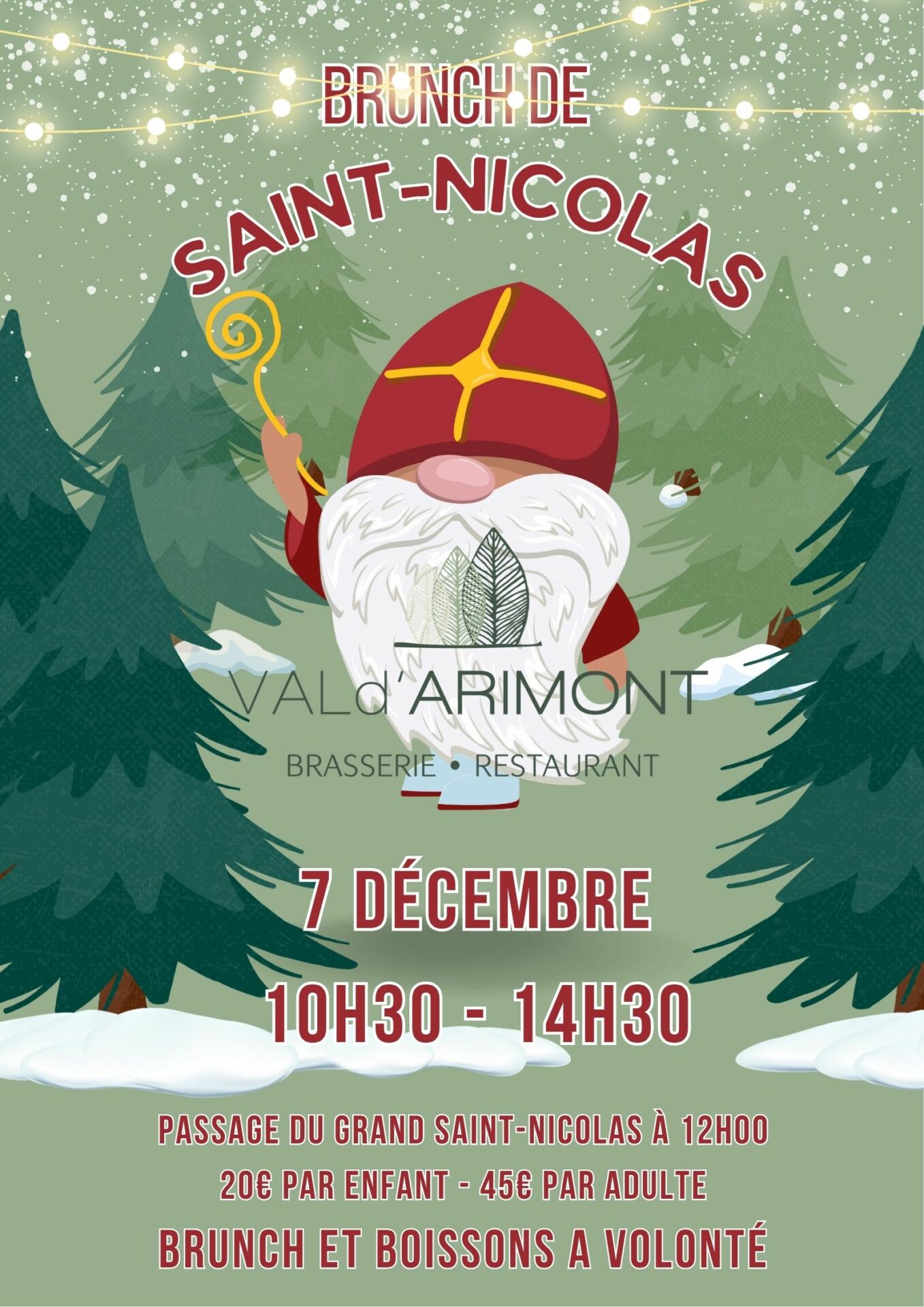 Passage du grand Saint-Nicolas à 12h00. 20€ par enfant – 45€ par adulte. Brunch et boissons à volonté.
